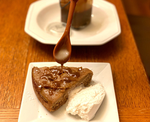 Cardamom Pear Upside-Down Cake with Salted Caramel Sauce